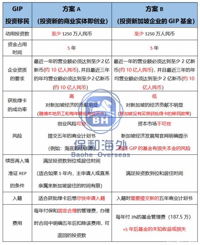 GIP方案A和方案B对比 新加坡保和移民的工作和服务是围绕政府引进高净值家庭的移民策略,把海外企业家的现有资源高效利用在帮助本地企业成长,协助政府推动产业结构升级。保和移民根据多年办理的投资/创业投资移民的经验,把新加坡政府的行政措施结合并落地到市场上的供需关系,凭借保和移民自身对市场发展规律的把握,以及深谙政策法规来创造核心竞争力。
