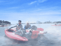 第三,在两个Buddies共同的力量协力抬上之后,左右滑动摇摆,以抖出皮艇里面空间的水。