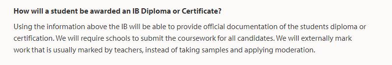 IB将提供学生文凭或认证的官方文件。IBO将要求学校提交所有考生的课程作业(以前是抽一部分上传),为IBO来批改(以前是老师批改)。