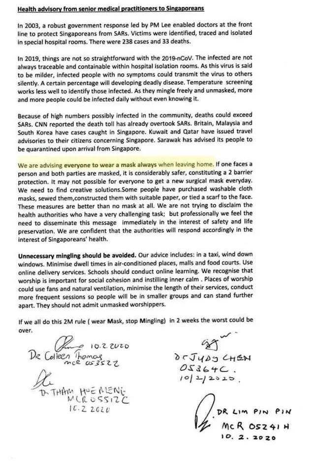 2月11日,新加坡四名资深医生联名签署了一封公开信,建议新加坡居民出门都应该戴着口罩,不论他们有没有感到不适。当时麦主任对这封公开信的回应是:目前没有证据表明它是空气传播的。尽管戴着口罩,人还是会经常接触许多可能沾有病毒的表面,例如我们离不开的手机。因此,保持个人卫生才是避免感染新冠肺炎更有效的方法。