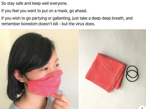 新加坡总理夫人何晶(4月1日)在脸书发帖呼吁大家手工制作口罩。她说“任何口罩都比不戴口罩要强。戴口罩可以帮助降低感染风险”
