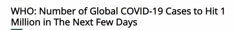 “世界卫生组织:全球新冠病毒病例将在接下去几天冲到1百万”
