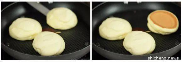 然后加一丁点清水,盖上锅盖煎8-10分钟,这个口感超好的日式舒芙蕾松饼就完成咯。
