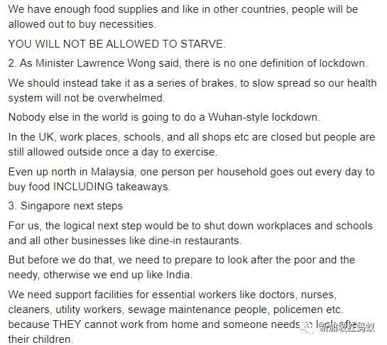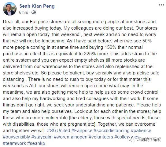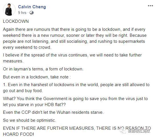 前官委议员郑恩里中午12时也在面簿上说, 即使当局有进一步的防疫措施,我们也没有理由囤积食物。因为新加坡有足够的食物供应,和其他国家一样(即使锁国),人们将被允许外出购买必需品。你不会挨饿的。