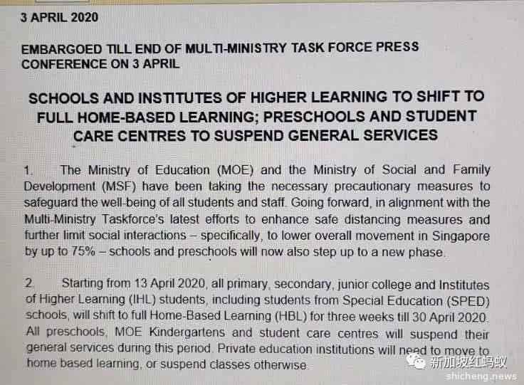接着,中午时分红蚂蚁的电话又响了,有人用简讯发来一则还未宣布的新闻稿的截图,上面写道:“新加坡将会在4月13日起停学两周”。后来,总理在下午的演讲中也证实了停学的消息,不过是从4月8日至5月4日,停课一个月。