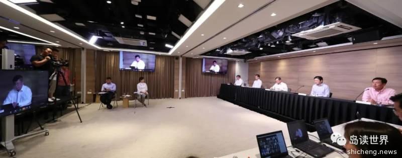新加坡抗疫跨部门工作小组首次直播记者会情况,出席的包括坐在主桌的卫生部医药服务总监麦锡威副教授(左起)、贸工部长陈振声、卫生部长颜金勇、社会发展部长黄循财和教育部长王乙康,社会及家庭发展部长李智陞和人力部长杨莉明也列席,大家在会上都保持安全距离。(通讯及新闻部提供)