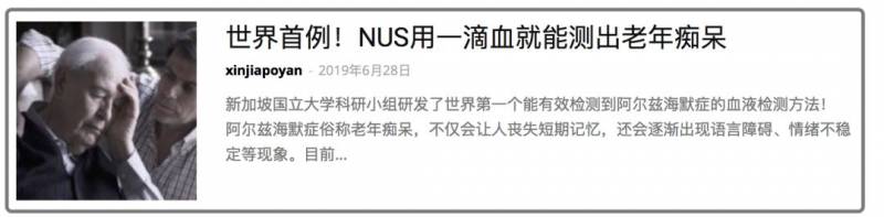 前一段时间,新加坡国立大学还研发出了用一滴血测出老年痴呆的新科技。