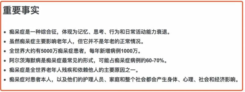目前,全世界就有5000万老年痴呆症患者。根据世界卫生组织的预测,到了2030年,患者人数将倍增至8200万人,到了2050年更会增至1亿5200万人!