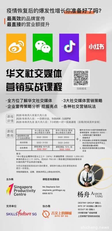 华文社交媒体课程要开课啦!点击以下连结或者更多信息针对新加坡的餐饮企业,2020社交媒体营销实战课程启动,政府资助90%费用助力走出困境