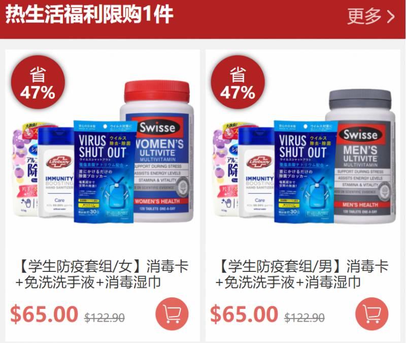 市场价:S$122.9现套组秒杀价:S$65【套组内含】swisse男/女复合维生素 *1日本随身空气消毒卡 *1联合利华免洗洗手液50ml*1Unicharm消毒湿巾*1