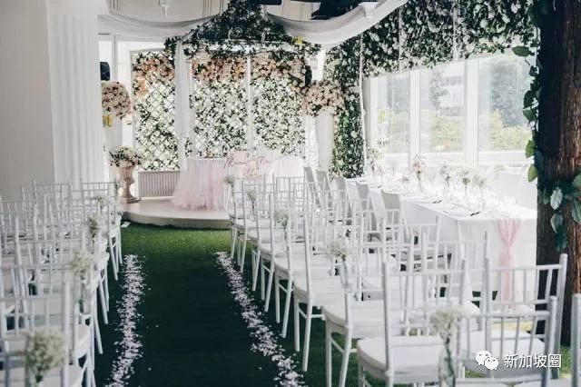 Blisshouse从落地窗到天花板,都是以白玫瑰作为垂坠,十分得浪漫美丽。地板是人造的草坪,整个布局给客人身处白玫瑰园的感觉。