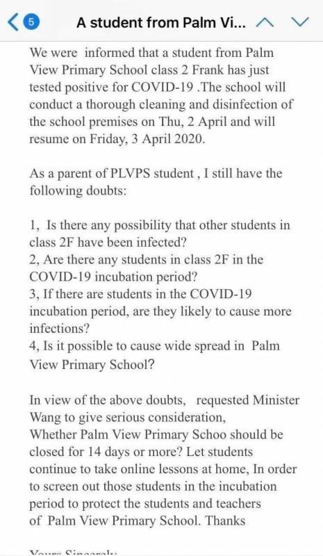 本地康伟小学的一位二年级在校生,在4月2日被确诊为新冠,校长当即通知了所有家长这个消息,该学生最后一次进入校园是3月30日。由于疑似感染,他4月1日没有到校,学校也在他确诊后立即宣布封校停课一天,进行彻底消毒,并于4月4日重新开放。因为该学生是被家人传染感染的,他在3月期间并没有出过国,学校的处理办法是:所有和这名学生有密切接触的学生和教职人员从4月2日起放14天缺席假。