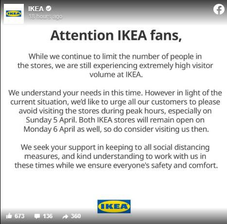 宜家宣布将从(7日)关闭本地的两家分店,直到5月4日。不过,网购平台还会继续营运。