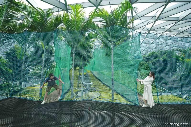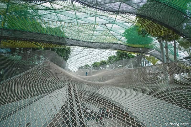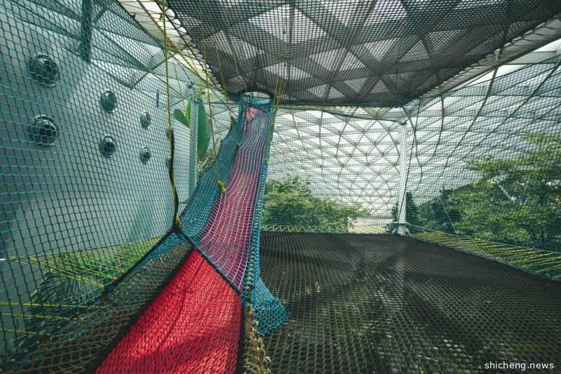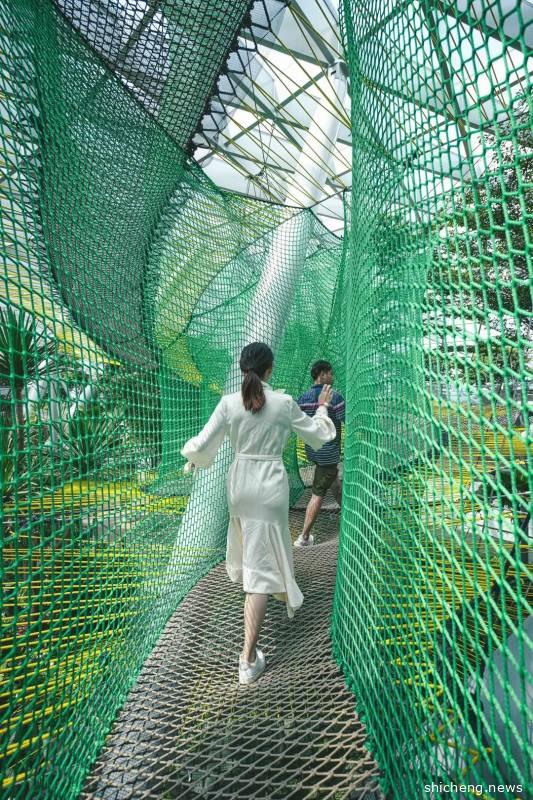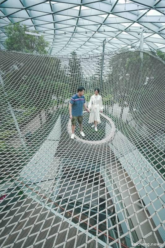 绝对是紧张刺激的体验项目!非常值得打卡!这是一个悬在离地25米的高空是一条长50米的网状步道,走起来轻盈有弹性,但也步步惊心,走到中间部分低头一看会发现自己走在外围商场的高空中,可以直接看见一层地面,特别刺激,建议来玩步行网的宝宝们还是穿上裤子和运动鞋比较方便,不然还真有可能被“一览无遗”了~