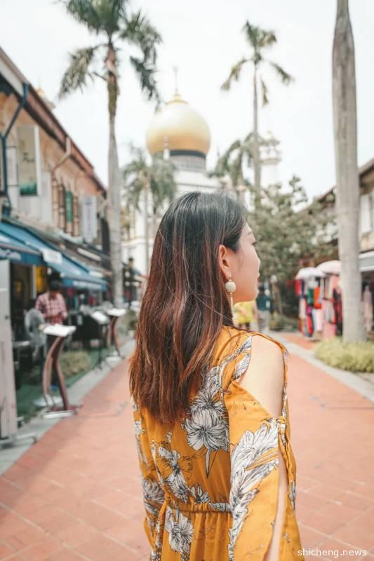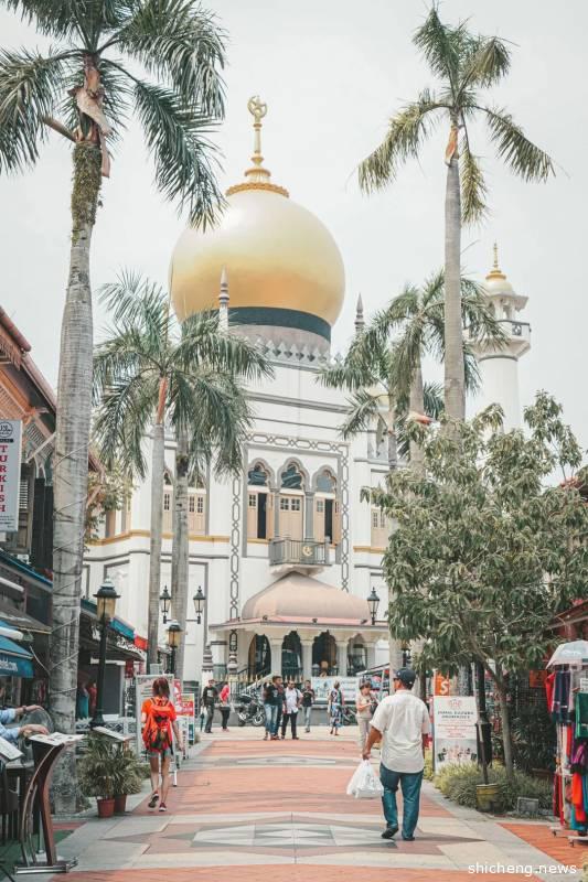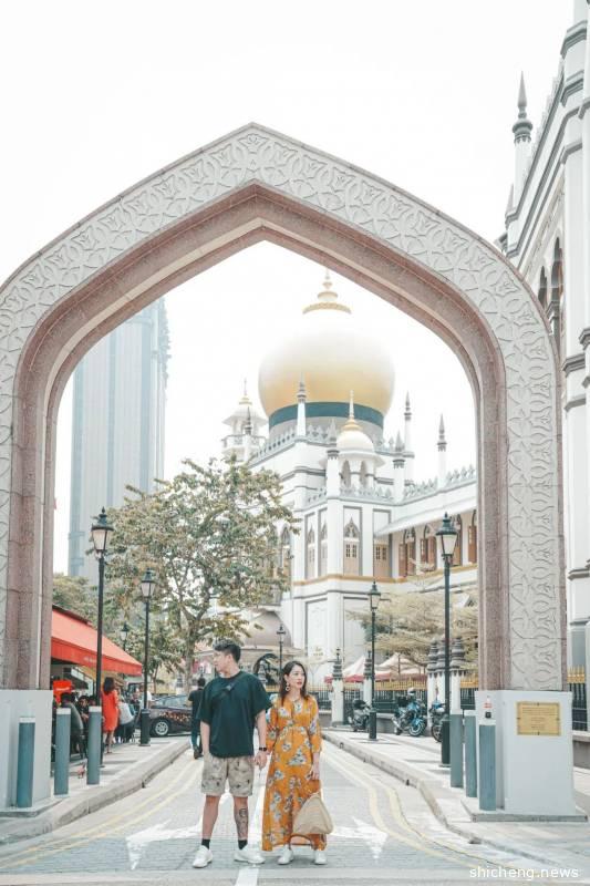哈芝巷的旁边是阿拉伯街,画风一变充满各种阿拉伯元素,甘榜格南最引人注目的当然要数中间这个清真寺,两边入口处都有一个拱门,看起来有点像阿里巴巴里的魔幻门。