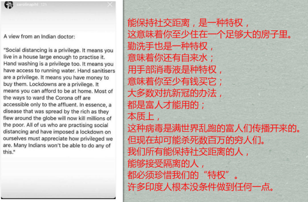 "所有能保持社交距离、接受隔离政策的人,都必须珍惜自己的‘特权’。因为许多印度人,根本没有条件实行这一切。”