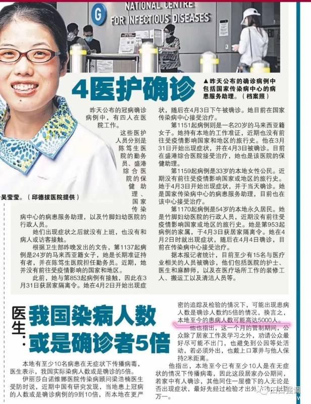 据新加坡联合早报报道,至少有10名病人被无症状传播者感染,而实际感染者可能是确诊者的5倍。换言之,新加坡至今的患者可能高达5000多人。截止4月6日,新加坡确诊患者为1309人。