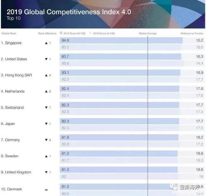 2019年10月9日,世界经济论坛(WEF)发布《2019全球竞争力报告》,新加坡超越美国和香港问鼎榜首。在该指数的12个评估指标中,新加坡在基础设施(95.4)医疗卫生(100)和劳动力市场(81.2)方面排名第一,在金融体系(91.3)和宏观经济稳定性方面(99.7)也获得了高分。新加坡优越的教育体系、健全的公共设施、优美的生活环境以及丰厚的社会福利,使它成为人们青睐的宜居移民城市。