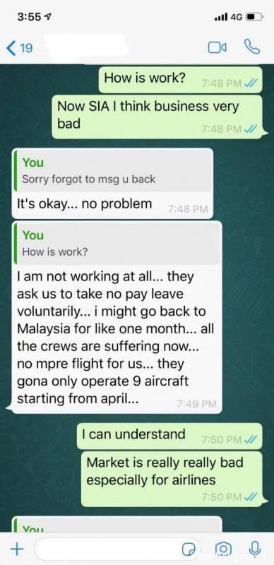 (我完全没有工作,他们要求我们主动申请无薪假期……我可能会回马来西亚一个月……所有的空乘人员都很惨……我们已经没有航班了……从4月开始,公司只会运营9个航班。)