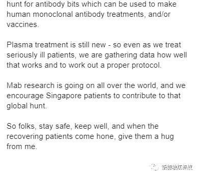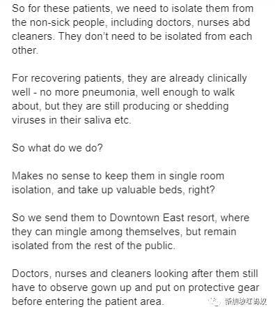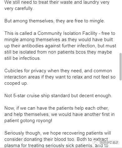 何晶说,有些人说,这不是隔离设施。她接着为大家解释,居家通知隔离和康复中或已确诊患者的隔离有何不同。她说,对于接获居家通知的人,我们不知道他们是否携带病毒。因此,无论他们是待在家里还是住在酒店,他们都必须远离其他人,以防他们在毫无症状时已携带病毒,传染给他人。所以,居家通知的隔离是在14天潜伏期内被单独隔离。对于康复中或已确诊的冠病患者,无论他们病情轻微,中度还是非常严重,我们知道他们体内都有病毒。所以对于这些患者,我们只需把他们与非患者,包括健康的医生、护士和清洁工,隔离开来。但冠病患者之间是不需要相互隔离的。康复中的患者,他们的临床表现已经很好了——没有肺炎,可以四处走动,但他们的唾液中仍然带有病毒。如果把他们单独隔离在一个医院房间里,占用宝贵的病床,那就没意义,对吧?所以我们把他们送到了白沙职总D’Resort度假村,在那里他们可以相互交流,但仍然与其他健康公众隔离开来。但照顾他们的医生、护士和清洁工进入社区隔离设施前仍然要穿上防护服等装备。我们仍然需要非常非常小心地处理他们的垃圾和衣物。这就是所谓的社区隔离设施——他们相互之间不需要进行隔离,因为他们已经有了冠病抗体来抵抗再次被感染,但他们可能还具有传染性,所以仍须与非患者隔离开来。卫生部早前透露,该设施是根据现有的政府隔离设施来设计,并有更高基线水平的感染管控。夫人也说,小隔间可以保护他们的隐私,如果他们想放松一下,不想被关在里面,可以选择到公共的交流区域。虽不是五星级游轮的标准,但还算过得去。的确,在这个医护资源短缺的特殊时期,能享有基本的医疗设施已经算不错了,我们的首要考量不是奢侈舒服的享受,而是照顾好健康和生命。夫人也打趣说,在社区隔离设施里,患者之间互相帮助,我们可能成为全球第一个患者之间展现守望相助(gotong royong)精神的国家。文末,夫人也呼吁康复中的冠病患者考虑捐血,除了可以提取血浆来治疗重病患者,还可以用来开发单克隆抗体(monoclonal antibody)医治患者和研发冠病疫苗。何晶说,血浆治疗仍处于探索性阶段,即使用于治疗重病患者,我们还在收集数据,看看医疗效果如何,并制定出适当的程序。世界各地都在进行冠病有关的实验研究,我们鼓励新加坡的患者也能作出医疗实验贡献。至于单克隆抗体,红蚂蚁现为大家科普一下,单克隆抗体是仅由一种类型的免疫细胞或具有相同抗体分子的细胞系复制出来的抗体,抗体与病毒的某些蛋白质结合,能降低病毒感染人体细胞的能力。当局还未透露位于新加坡博览中心的社区隔离设施何时启用,能容纳多少人?但在红蚂蚁心底里,希望这个设施永远都不需要启用,也不需要再征用其他地方来用作社区隔离设施。