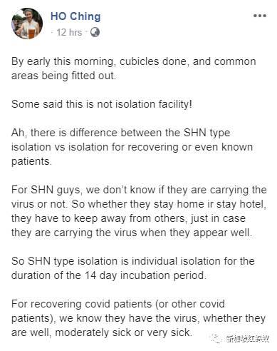 随着冠病确诊病例激增,为了保障本地急症医院的运作能力,白沙职总D’Resort度假村早前被列为本地首个社区隔离设施,让病情已好转或病情轻微不需要医疗援助,但体内还有病毒仍有传染风险的患者,出院后在这里继续隔离和接受照料,直到完全康复才回家。然而,可容纳500人的白沙职总D’Resort度假村在3月24日投入运作后,截止4月4日已住进了386名病患。眼看白沙职总D’Resort度假村即将无法负荷,当局5日宣布将新加坡博览中心(总面积超过12万3000平方米)列为本地第二个社区隔离设施。李显龙总理的夫人何晶九个小时内两度在个人面簿发文,抢先为大家介绍了这个“新加坡版方舱隔离中心”,感谢并赞扬在幕后默默耕耘的工作人员漏夜赶工改装新加坡博览中心。