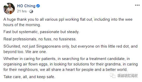 何晶昨晚11时15分上载已被改装成社区隔离设施的博览中心的照片时,感激所有参与的员工在短时间内全力以赴地完工,甚至在凌晨时分赶工。夫人写道:“快速但系统化,充满热忱和沉着;真正的专业人士,不计较,不容易被激怒。”她说:“新心相连”(SGunited),不仅限新加坡人而已,而是在这小红点上的每一个人,和跨越这个国家的每个人。我们全都是一体。”何晶指出,不论是照顾病人、找寻治疗方案、安排空运鸡蛋、为阿嫲寻找解决方法,或关心邻居,我们都对人民和一个更美好的世界都应怀有同样的爱心。从夫人提供的照片显示,博览中心里头以白色为主的坚固材料搭建了一个一个的隔间,井然有序。不过,有网民留言说设施看似相当简陋,也担心每个空间没门没天花板,既然没有单独密封起来,病毒很可能会传播开来。