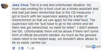 也有网民点出申请程序的放宽很可能会造成立意良善的援助金被滥用。“我原本在一间食阁任职饮料店员的妈妈因为政府的“断路器”措施被裁退了。我和她的上司联络,要求取得用来申请援助金的遣散信,但她的上司却叫告诉我这不需要信件,只要直接去告知当局她被裁员就可以了。很不幸的,如果申请援助金并不需要一些官方文件佐证,那滥用援助金的情形就有可能发生。就算是许多真实个案需要被立即协助,我们也不应该容许滥用援助金的事情这么轻易发生。”