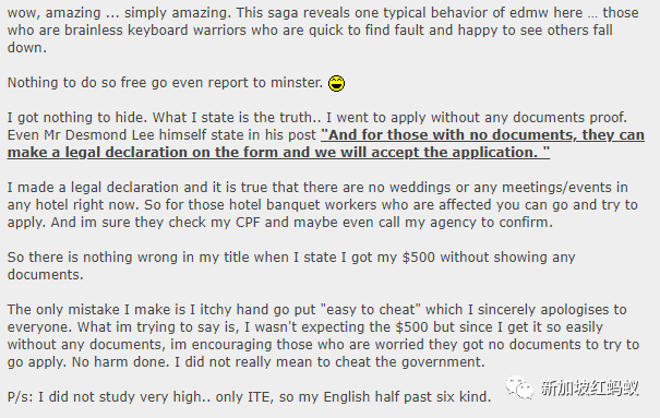 援助金申请页面最后要求申请人作出法律声明。(网站截图)换句话说,一旦被查出利用虚假资讯作出申请,任何人都有可能被秋后算账,甚至面对法律制裁。根据李智陞提供的最新数据,目前已有超过10万名国人提出申请。疑似当事人称自己一时“手痒” 李智陞在面簿上传网民声称援助金“很好骗”的贴文,并宣称内政部会有人找该名网民聊聊后,一篇疑似当事人回应的贴文出现在相关论坛网页上。该名相信担任宴席服务生的网民声称,由于疫情导致全岛酒店没有任何婚礼、会议或活动进行,因此其在签署法律声明的过程中并没有作假,并强调他早前“没有呈交任何证明文件就获得500新元”的贴文标题并没有错。该名网民只愿意针对自己“手痒”写下的“很好骗”(easy to cheat)道歉,并辩称自己没想到能在没有证明文件的情况下申请到援助金,因此才想鼓励其他因没有证明文件而担心申请不上的人们也去申请。该名网民强调自己无意欺骗政府,同时声称自己的学历不高,英文水准不高。
