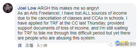 “看了真令我气愤!作为一名艺术自由工作者,我因为学校停课而失去了所有的收入来源。我上周四就到联络所申请了援助金,并且附上收入减少的证明文件,结果我到现在还在苦等用来度过难关的援助金,然后居然还有人在滥用这个系统。”