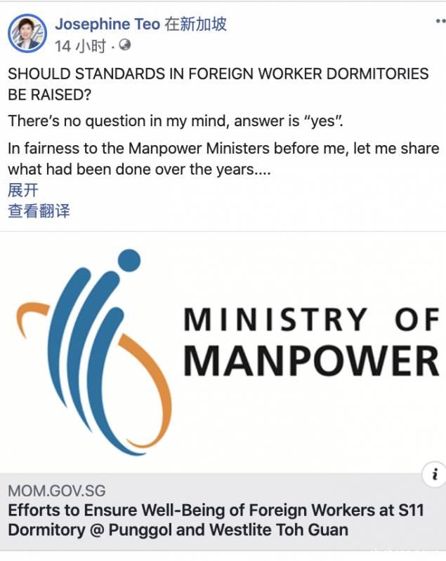 人力部长杨莉明昨晚在面簿贴文回应此事时说,本地的劳工宿舍水平毫无疑问应当提升,当局历年来已不断改进劳工宿舍环境。她也承诺在疫情得到控制之后专门应对这个问题,并呼吁雇主要为劳工福利做出投资。