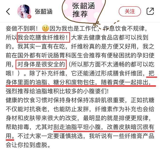 “一般来说一天25g膳食纤维,就能维持我们肠道的正常功能。张韶涵推荐的纤维粉,含有可溶性膳食纤维 用独特的“包裹式吸油”方式,把体内废物、糖分、胆固醇排出体外。”