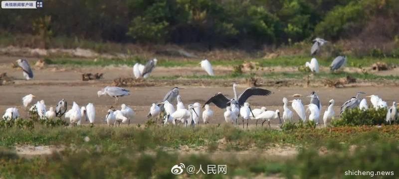 广东阳江海陵大堤湿地,60只全球第二濒危的水禽黑脸琵鹭,也翩翩而至。