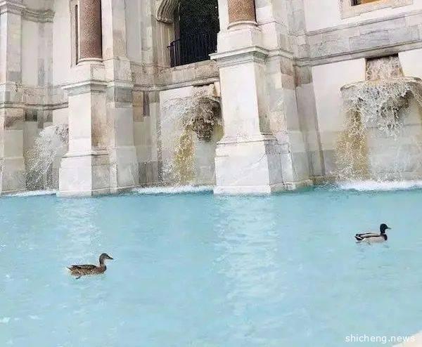 原本挤满了人丢硬币许愿的水池,现在有小鸭子悠闲游来游去~