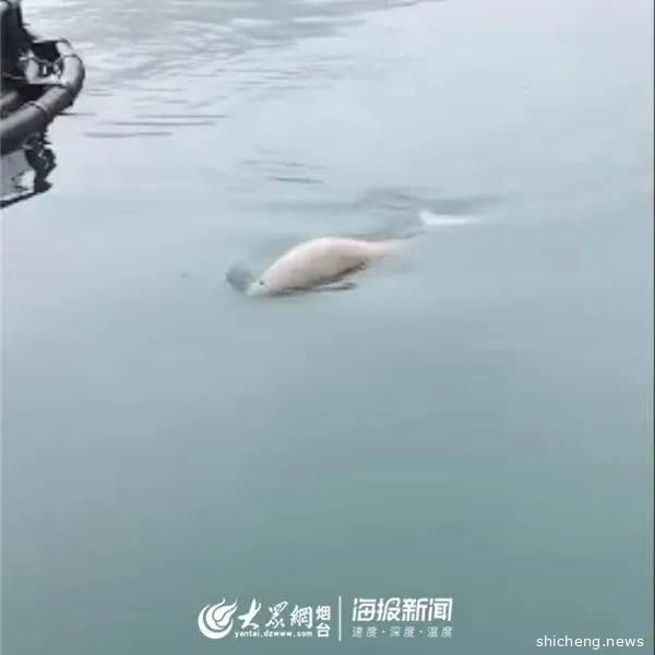 山东长岛综合试验区一只野生白江豚,久违地出现在了大钦岛乡南村海域。