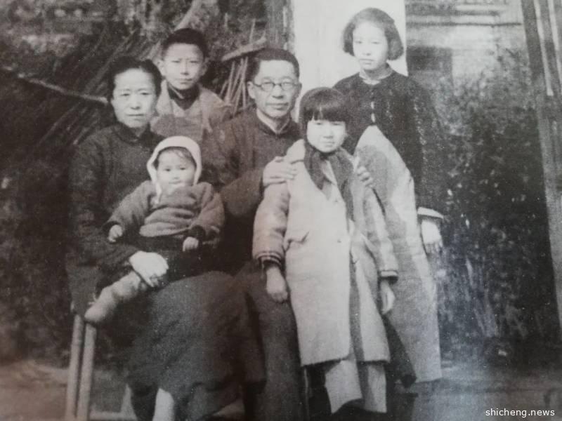 老舍全家福1946年初摄于重庆北碚。(左起)妻子胡絜青、舒乙(后)、舒立(前)、老舍、舒雨、舒济