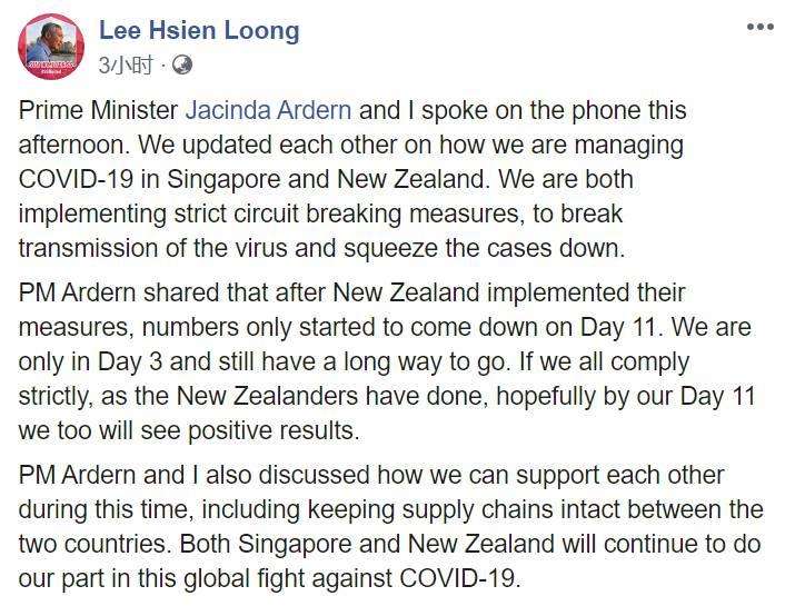 李显龙:希望阻断措施实行第11天后和缓 近日新加坡疫情状况不断恶化。今日,李显龙总理与新西兰总理阿德恩通电话,针对两国政府如何管控疫情相互交流。 李总理在面书贴文中指出,新西兰上月底开始落实严格的阻断措施后,疫情直至第11天才趋缓。他表示,新加坡民众若能同新西兰人民一样,严格遵守阻断措施,措施或许有望在本月中旬发挥成效。