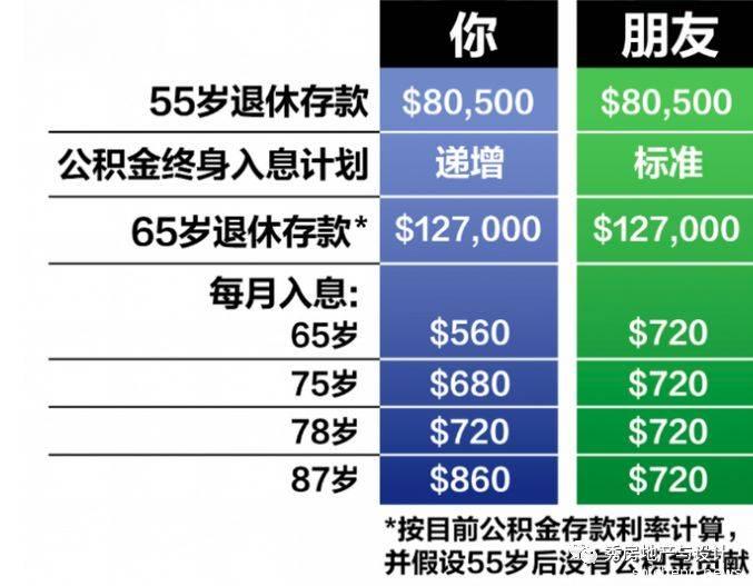 即一开始将领取较低的每月入息,过后逐年增加2%如果你想要在65岁退休时就开始领取入息,又担心未来通货膨胀压力,那这种入息分配方式可能适合你。你和朋友在55岁时都选择保留8万零500元的基本存款,她选择标准计划,你选择递增计划。如果你们55岁后都没有公积金贡献,当你们65岁时,退休户头都会有12万7000元。你朋友开始每月领取720元入息,你只有560元。你要到大约78岁,每月入息才会达720元,不过之后的每月入息就会比较多。到了87岁,你每月拿860元,比朋友多近20%。因为你一开始领的入息较低,所以要一直到大约90岁时,获得的入息总额才能追平朋友的数目。