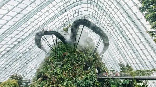 植物冷室云雾林(Cloud Forest)坐落在花穹的旁边,是新加坡滨海湾花园里自带“仙气”的地方。室内瀑布从山顶一泻而下,定时喷出的水汽使得整个冷室里云雾缭绕,宛如仙境一般。登上树梢走道和云雾廊,可以俯瞰到郁郁葱葱的山林景观,体验一番妙不可言的高空漫步。