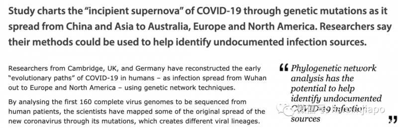 剑桥麦克唐纳考古研究所研究员福斯特说:"遗传网络分析有可能帮助识别不明新冠感染源,然后可以隔离,以遏制该病在全球的进一步传播。"