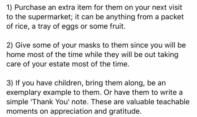 不仅仅是政府在努力,网民也表示对客工十分担忧,因为客工宿舍群体感染情况严重,清洁工作量也繁重了许多。新加坡网民Andy Loe昨天(9日)在Facebook发文呼吁:下次去超市时为他们买些食物;如果有多余的口罩请给他们,因为国民可以大部分时间在家里,他们却要一直在外面做清理工作;家长可以带着自己的小孩一起为他们写感谢卡,为他们的付出表达感谢和加油。