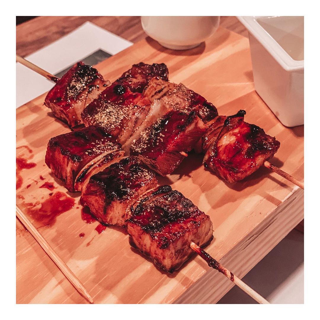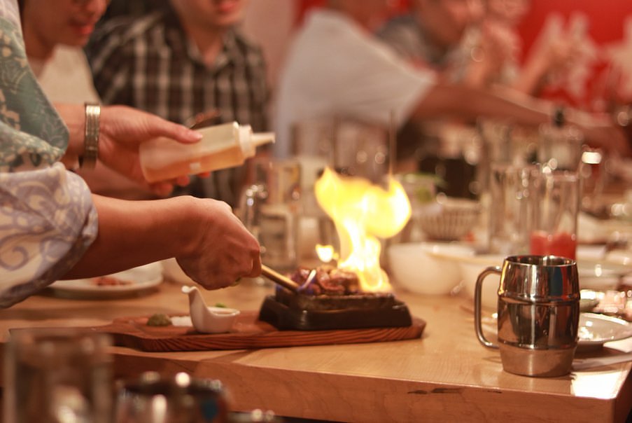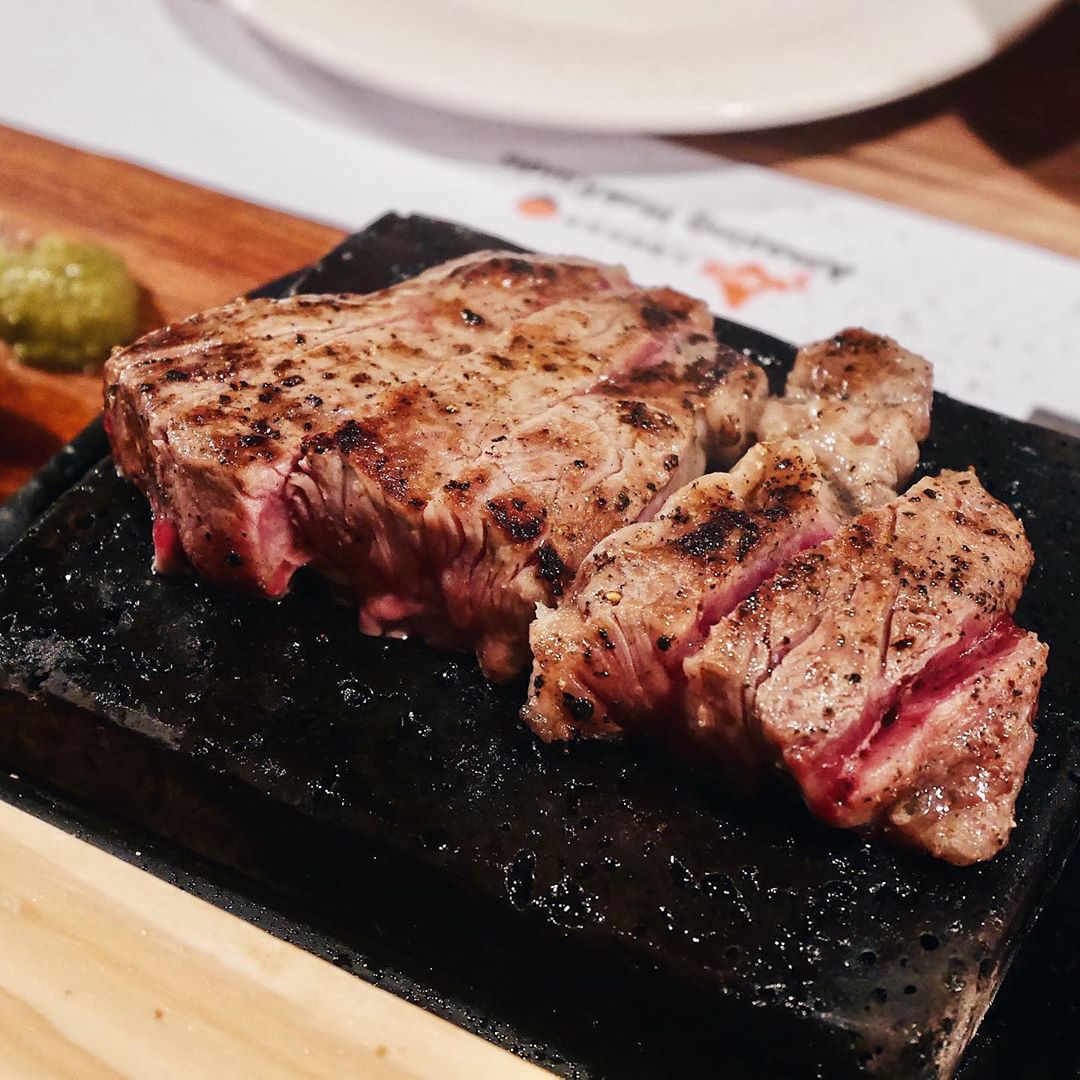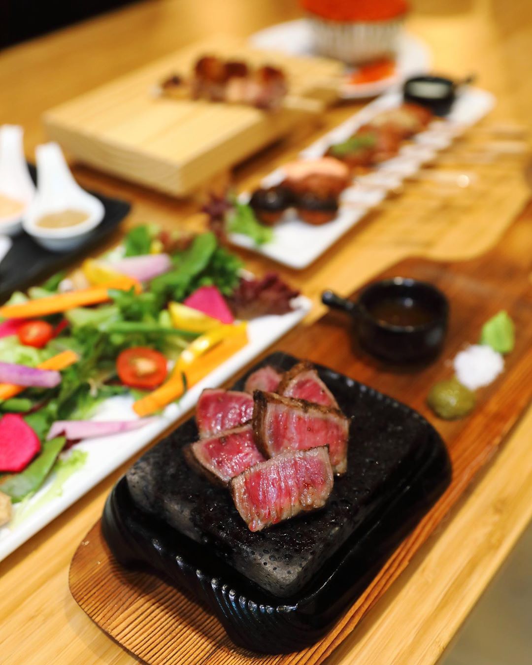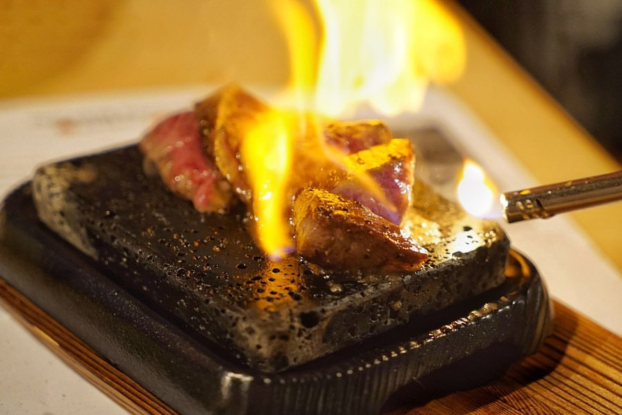 服务员会将这道美食直接带到您的桌子上,在熔岩石板上现场烤制,每一处的烤制都如此完美和细致,激发出牛肉的鲜美,搭配上yuzu kosho , sea salt, wasabi或者其他的酱,美味更上一层楼。