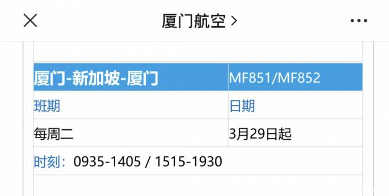 3月29日起 厦门航空保留 厦门--新加坡往返航班