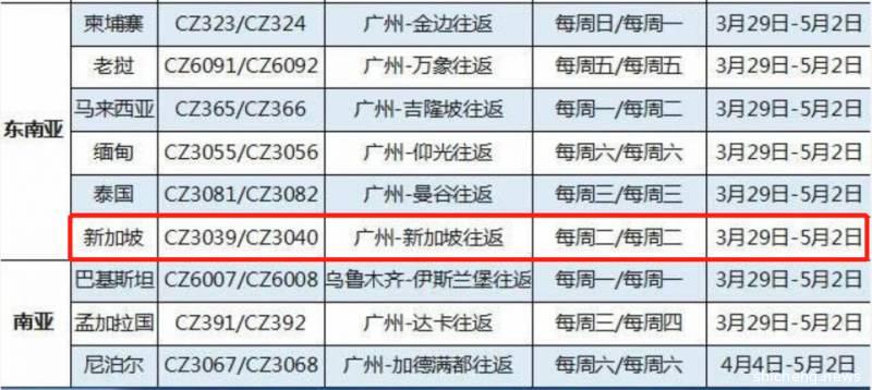 3月29日~5月2日 中国南方航空保留 广州--新加坡往返航班