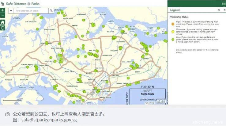 即时地图为大家把人流情况分为了三种,分别是人流极限、人流很大、人流很少。地图还会把一周7天的人流量帮大家标注出来。 想去公园的民众们可以查看 safedistparks.nparks.gov.sg