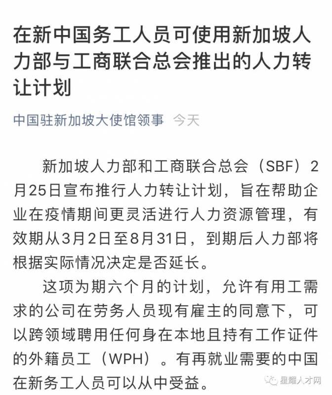 新加坡人力部和工商联合总会(SBF)2月25日宣布推行人力转让计划,旨在帮助企业在疫情期间更灵活进行人力资源管理,有效期从3月2日至8月31日,到期后人力部将根据实际情况决定是否延长。
