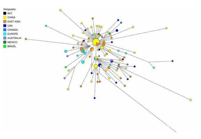 研究人员发现,在蝙蝠和穿山甲身上发现的最接近新型冠状病毒类型是A型,也被研究人员认为是疫情的根源,即感染人类的原始病毒基因组,存在于中国武汉,但并不是该市的主要病毒类型。B型是通过A型突变而来,而C型又是B型的“女儿”。