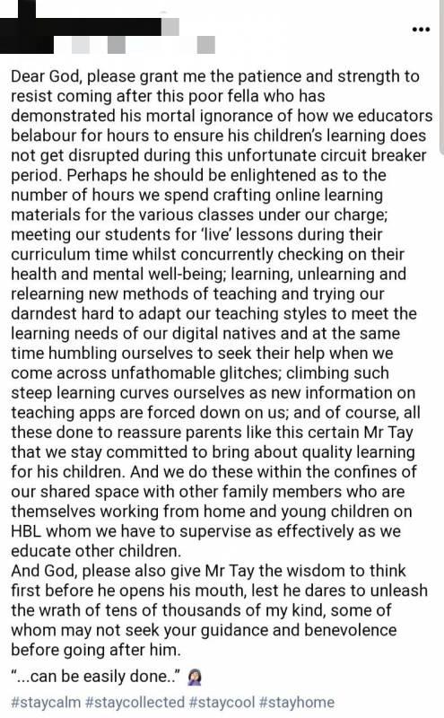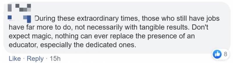 “也许他应该更开明些,想想我们花了多少时间来制作我们所负责的,各个班级的在线学习材料;还要在课程期间与我们的学生见面,进行‘直播’课程,同时关注他们的身心健康。