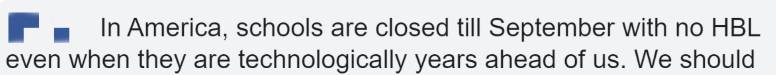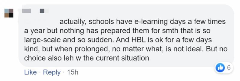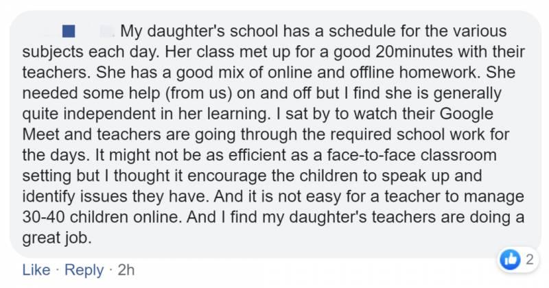 我只需要坐在那里看他们的Google Meet,老师们正在忙着准备这几天的功课。(居家学习)可能不像面对面的教室教学那样有效,但是我认为它鼓励孩子大声说出来并确定他们遇到的问题。对于老师来说,在线管理30-40个孩子并不容易。而且,我真的觉得我女儿的老师做得很好了。”