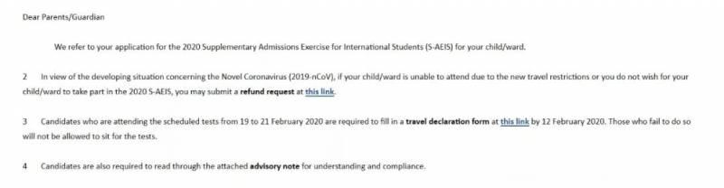 新加坡教育部2月6日宣布,受新加坡政府目前有关新型肺炎的入境限制政策影响,部分考生来自中国大陆地区或者到访过中国的考生将无法参加S-AEIS考试。