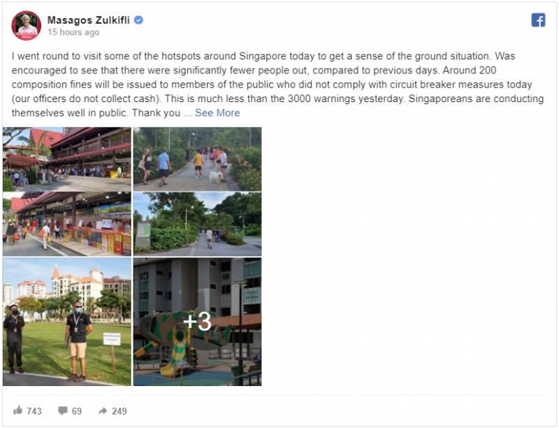 新加坡环境及水源部长马善高也在周末走访了本地一些热门地区,以了解该区情况,他发现相外出人出比起前几日大幅减少,因此感到鼓舞。并再次呼吁新加坡人继续待在家里,注意安全,保护自己、家人,以及社区。(图片来源:马善高Facebook)
